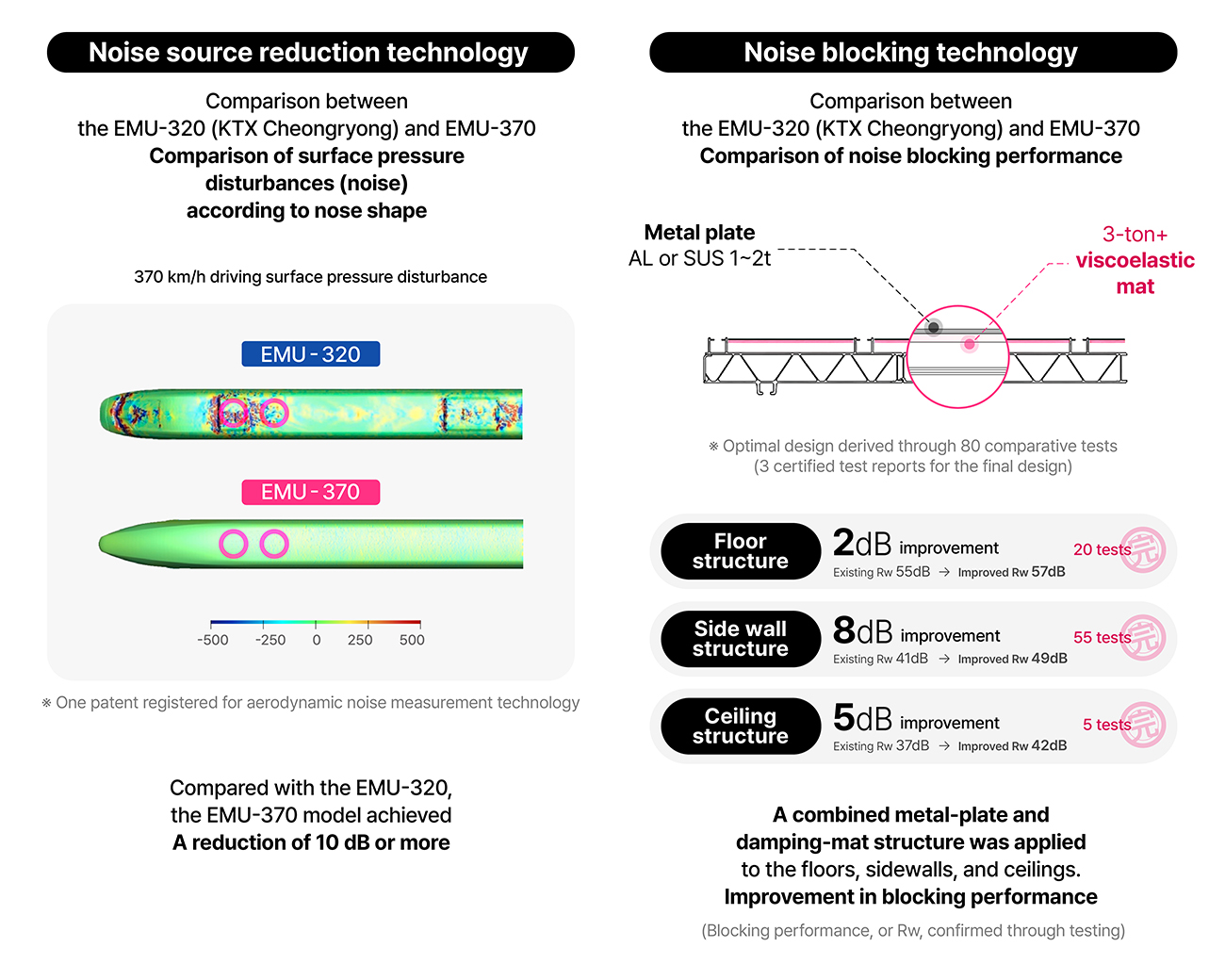 Another notable point is the combined application of aerodynamic noise reduction through improved nose shape, metal plate-viscoelastic mat composite structures applied to the floors, sidewalls, and ceilings, and vibration reduction design based on transmission path analysis.