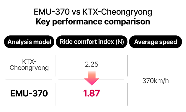 Specifically, the design and testing expertise in the ultra-high-speed domain secured through the development of the 430 km/h-class high-speed test train HEMU-430X served as the technological foundation for the development of the 370 km/h-class next-generation high-speed train EMU-370. The EMU-370 is the successor to the existing 320 km/h-class KTX-Cheongryong, targeting a maximum operating speed of 370 km/h and a maximum design speed of 407 km/h. Beyond simply increasing speed, the primary goal of this development was to realize a commercially viable ultra-high-speed train that simultaneously satisfies safety, quietness, and ride comfort under extreme high-speed operating conditions.